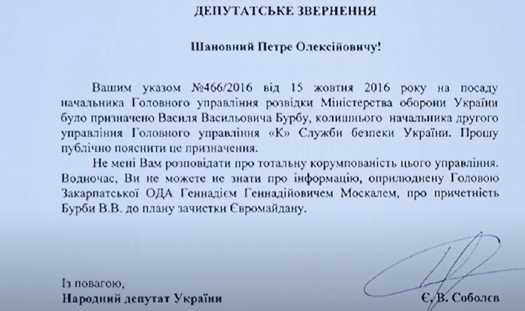 В октябре 2016 года появился указ президента Петра Порошенко о назначении Василия Бурбы на должность начальника ГУР Минобороны. Тогда еще народный депутат от "Самопомощи" Егор Соболев написал обращение к президенту Порошенко и министру обороны Степану Полтораку с требованием публично объяснить это назначение.