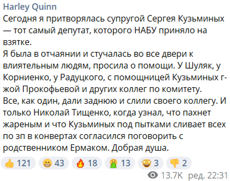 28 января в мессенджере Telegram создали канал "Harley Quinn", администратор которого заявил, что пообщался с представителями монобольшинства от имени жены народного депутата от "Слуги народа" Сергея Кузьминых, которого в тот же день задержали детективы Национального антикоррупционного бюро Украины (НАБУ) при получении взятки. На канале опубликовали скриншоты переписок якобы с политиками.