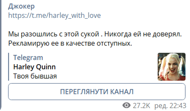 28 января на Telegram-канале "Джокер", автор которого ранее также неоднократно заявлял, что притворялся другими людьми и общался с политиками, появился пост со ссылкой на канал "Harley Quinn" и следующим текстом: