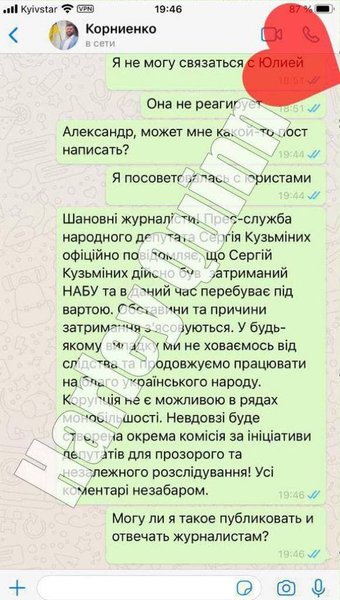 Первый вице-спикер Рады Александр Корниенко посоветовал "жене" связаться с медийщиками партии "Слуга народа", предоставил телефон некой Юлии и сказал, что предупредит ее о звонке. Судя по скриншотам, больше политик ничего не написал, хотя пранкер пытался согласовать текст поста для журналистов.