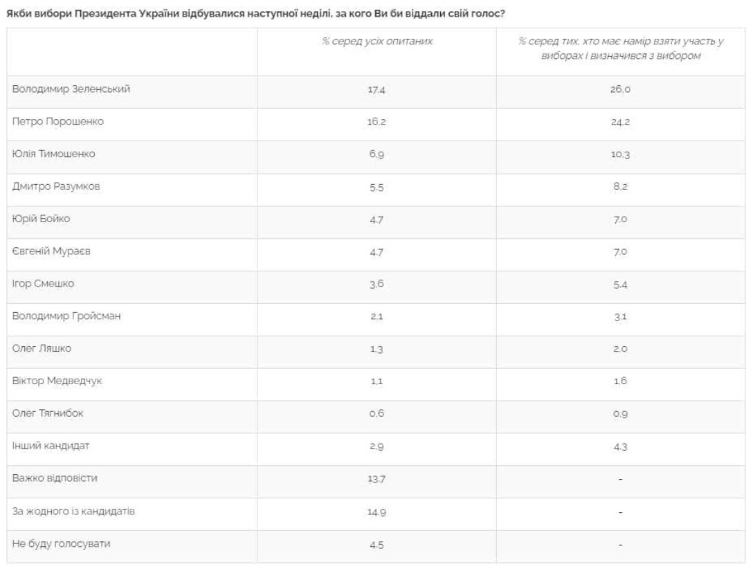 Лидер партии "Сила и честь" Игорь Смешко набрал 8,1 и 3,6% соответственно; экс-премьер-министр Владимир Гройсман — 2,1% и 3,1%; бывший лидер "Радикальной партии" Олег Ляшко 1,3% и 2%; глава политсовета партии ОПЗЖ Виктор Медведчук 1,1% и 1,6%. Последним в списке оказался лидер "Свободы" Олег Тягнибок — за него готовы отдать голоса 0,6% всех опрошенных и 0,9% тех, кто собрался голосовать и определился с выбором.