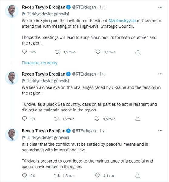 Эрдоган в своем Twitter отметил, что приехал в Киев по приглашению Зеленского, чтобы участвовать в 10-м заседании Стратегического совета высокого уровня.