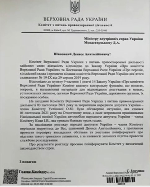 Он показал скриншот письма от комитета Верховной Рады по правоохранительной деятельности главе МВД Денису Монастырскому.