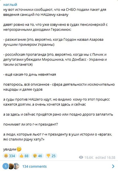 "Все описанное — сфера деятельности исключительно нацрады и судов. Суды против НАШего идут, но видимо кому-то этот процесс кажется долгим, а очень хочется здесь и сейчас. А за здесь и сейчас придется рано или поздно дорого заплатить. Понимает ли это президент?" – спросил он.