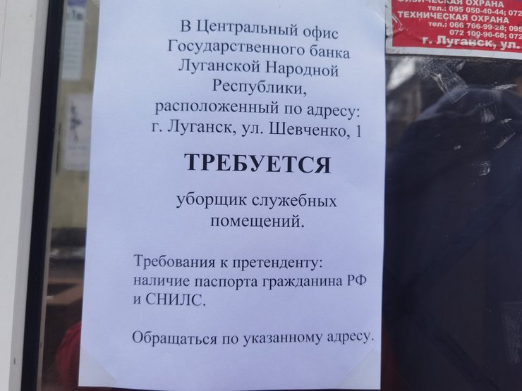 Член украинской делегации в ТКГ по урегулированию ситуации на Донбассе Сергей Гармаш 9 февраля опубликовал в Facebook фотографию объявления о найме на работу в Луганске. В главный банк террористов "ЛНР" требовался уборщик, но без паспорта РФ кандидатов не брали.