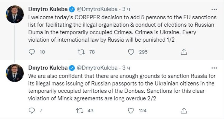 В другом твите Кулеба приветствовал сегодняшнее решение COREPER (Комитет постоянных представителей Европейского Союза) добавить 5 человек в санкционный список ЕС за содействие незаконной организации и проведение выборов в Госдуму России на территории оккупированного Крыма.