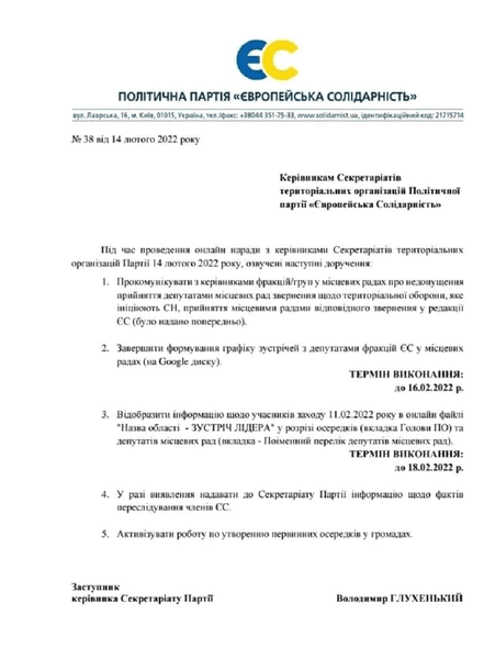 Депутат процитировал внутрипартийный документ "Европейской справедливости" в котором местным организациям приказывают блокировать в местных советах любые инициативы от "Слуги Народа" по развитию и усилению территориальной обороны.