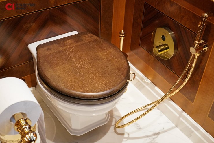 В туалете также много золотых элементов — как на самом унитазе, так и на кнопках слива воды и даже на шланге для биде.