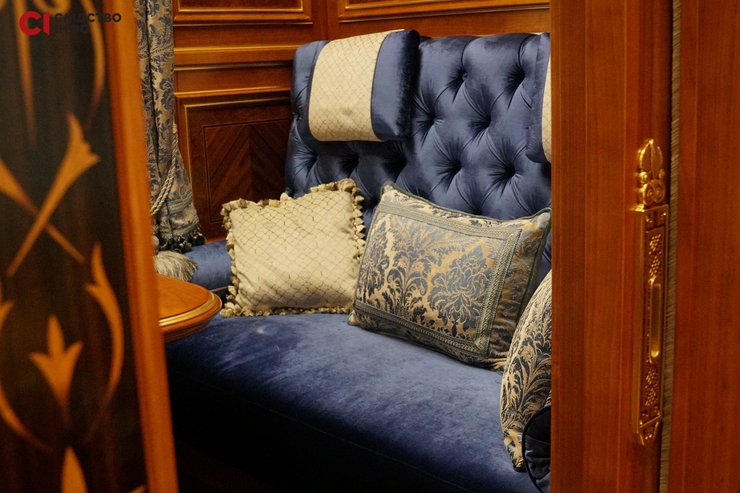 В вагоне мебель украшена бархатом и другими дорогими тканями, а светильники включаются от нажатия на сенсорные кнопки. Над головой – витражи.
