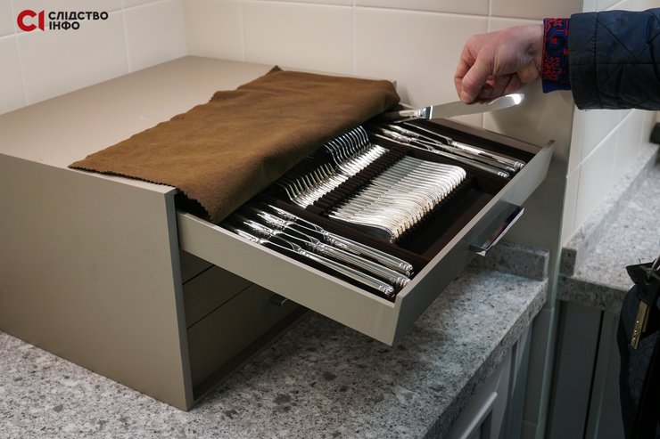 Шкафы и полки на кухне заставлены столовыми наборами от французского люксового бренда Cristofle Paris. Только сундук для хранения серебряных вилок, ложек и ножей стоит 14 тысяч гривен.