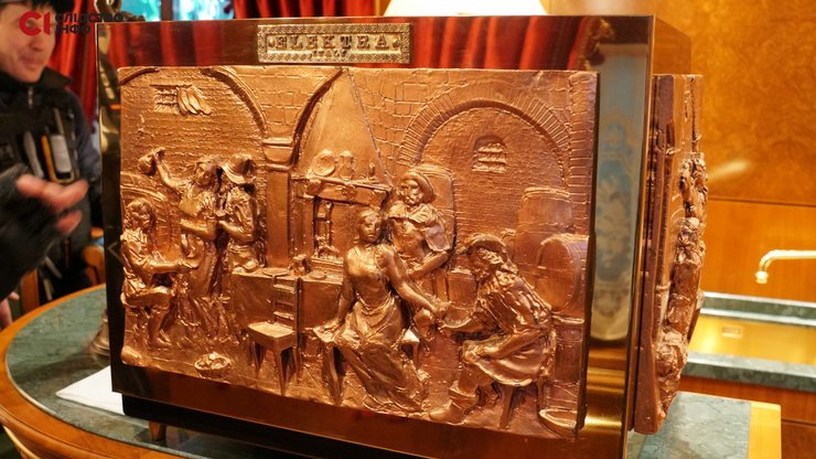 Внутри вагона — много позолоты, алого бархата и белых скатертей. Это больше похоже на музей, чем на вагон.