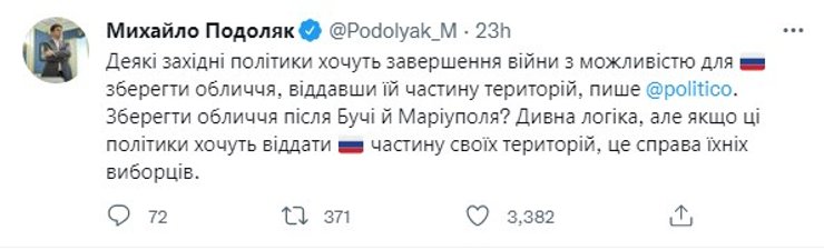 "Сохранить лицо после Бучи и Мариуполя? Удивительная логика, но если эти политики хотят отдать России часть своих территорий, это дело их избирателей", – написал советник.