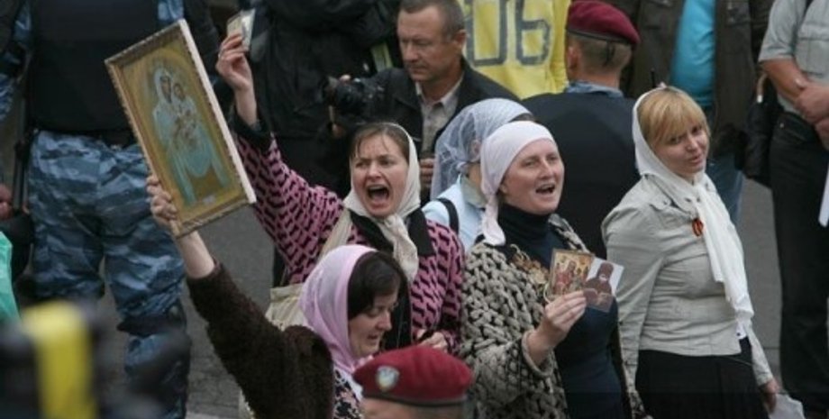 Они держат в руках плакаты с надписями: "Мы – православные, Кирилл – наш патриарх", "Братские народы – единая церковь", "Сохраним единство нашей церкви".