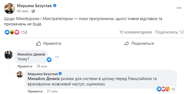 Вместе с тем замглавы Комитета Верховной Рады по вопросам нацбезопаности, обороны и разведки Марьяна Безуглая написала на своей Facebook-странице, о том, что Резников остается на посту, а в комментариях пояснила, что это якобы связано с проведением следующего заседания в формате "Рамштайн", которое состоится 14 февраля в штаб-квартире НАТО.