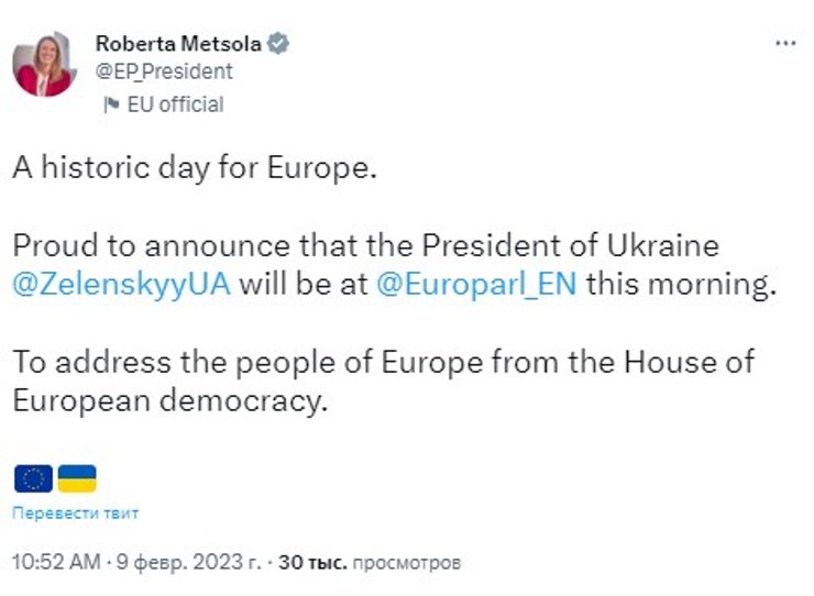 "Исторический день для Европы. С гордостью сообщаем, что президент Украины Владимир Зеленский будет в Европейском парламенте сегодня утром. Он обратится к людям Европы из Дома европейской демократии", — написала она.