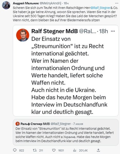 "Идите к черту со своими советами, господин Штегнер, вы не знаете, о чем говорите. Вы когда-нибудь были на войне в Украине 500 дней? Вы чувствовали страдания людей? Если нет, то оставайтесь на своем диване в стиле Бидермайер", — твитнул Мельник в ответ Штегнеру.