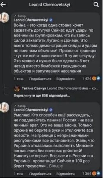Следствие установило, что на следующий день после начала полномасштабного военного вторжения российской армии в Украину Черновецкий опубликовал в соцсетях сообщения, в которых высказался о необходимости признать границы оккупированных территорий Луганской и Донецкой областей как самостоятельные субъекты.