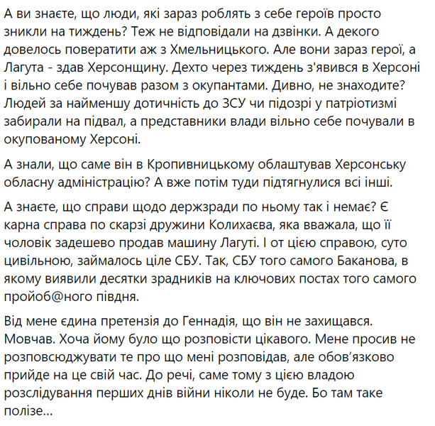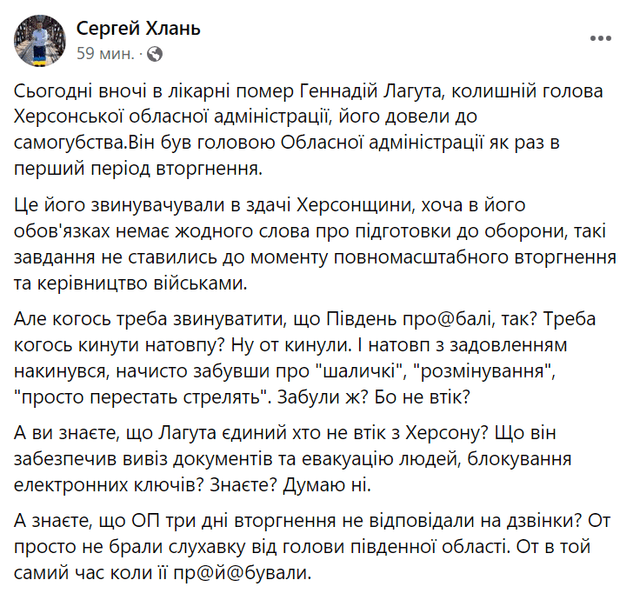 "А вы знаете, что Лагута единственный кто не сбежал из Херсона? Что он обеспечил вывозом документов и эвакуацией людей, блокировкой электронных ключей? Знаете? Думаю, нет", — написал Хлань.