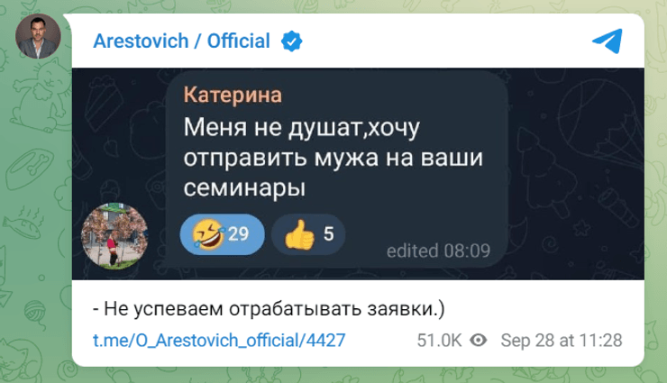 После распространения видео со своего семинара Арестович сообщил, что поток желающих на его семинары существенно вырос.