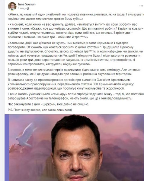 "И если какой-то участник этого "семинара" потом попытается обидеть женщину — тогда те, кто постоянно приглашал Арестовича на телемарафон, должны знать, что это и их ответственность", — написала она.
