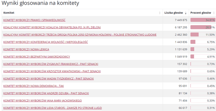 Ведущая партия "Право и справедливость" набрала 35,38% голосов, занимая первое место. На втором месте расположилась оппозиционная "Гражданская коалиция" с результатом в 30,7%.