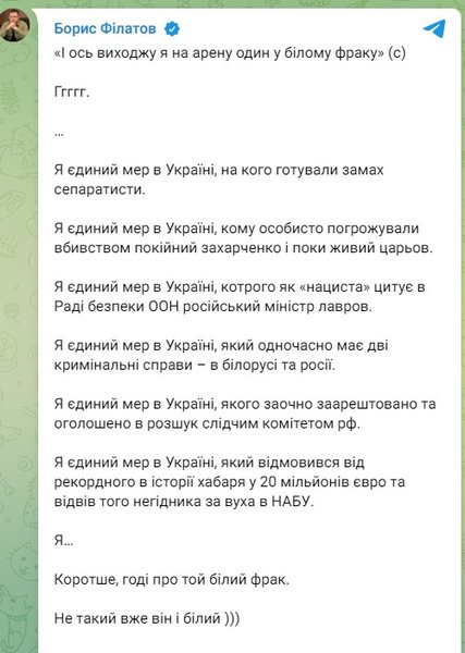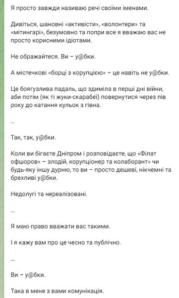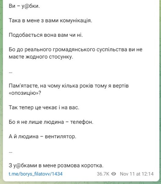 "А местечковые "борцы с коррупцией" — это даже не у**ки. Это трусливая падаль, которая вздыбилась в первые дни войны, чтобы потом (как те жуки-скарабеи) вернуться через полгода к катанию шариков из г*вна. Когда вы бегаете по Днепру и рассказываете, что "Филат оффшоров" — вор, коррупционер и коллаборационист" или любую другую ерунду, то вы — просто дешевые, никчемные и лживые у**ки. Непутевые и нереализованные", — написал в публичном канале Филатов.