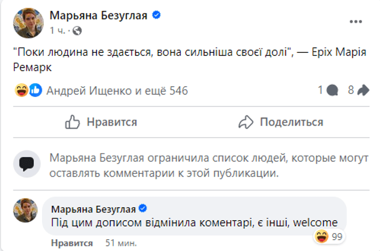 "После серии сообщений в соцсети Марьяны Безуглой, которые создают основы для разрушения единства в обществе, подрывают доверие к военному руководству государства в условиях военного положения, согласно решению нашей фракции, инициировала рассмотрение на комитете вопрос о лишении ее должности председателя подкомитета по вопросам демократического гражданского надзора и контроля", — сообщила Фриз.