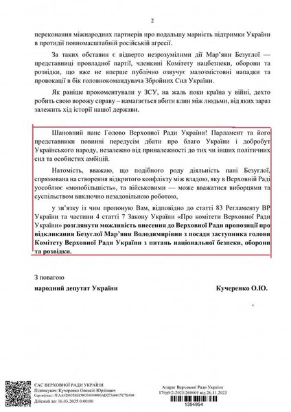 Вместе с тем нардеп от "Батькивщины" Алексей Кучеренко сообщил на своей Facebook-странице, что направил обращение к председателю ВР Руслану Стефанчуку с предложением немедленно отозвать нардепа Безуглую с должности заместителя председателя комитета по нацбезопасности и обороне.