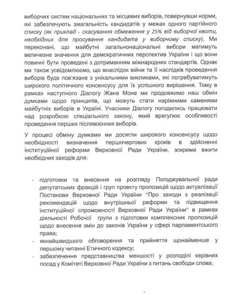 В тексте также написали, что парламентарии "обязуются воздерживаться от действий, которые могут дискредитировать работу парламента как внутри страны, так и на международной арене". Также отметили, что убеждены в важности общенациональных выборов, которые состоятся после войны.