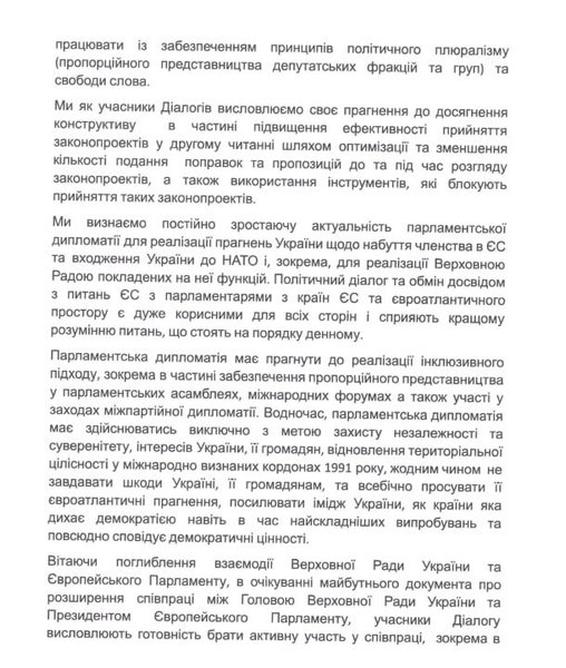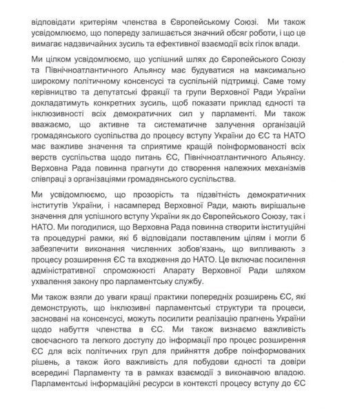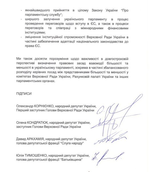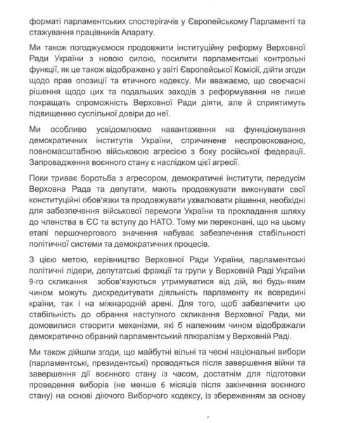 Кроме того, в документе указывают, что нардепы осознают вызовы, которые стоят перед Украиной в связи с российской агрессией, а также на пути в Европейский Союз. Поэтому согласились, что совместно будут реформировать парламент и принимать без задержек нужные стране решения.