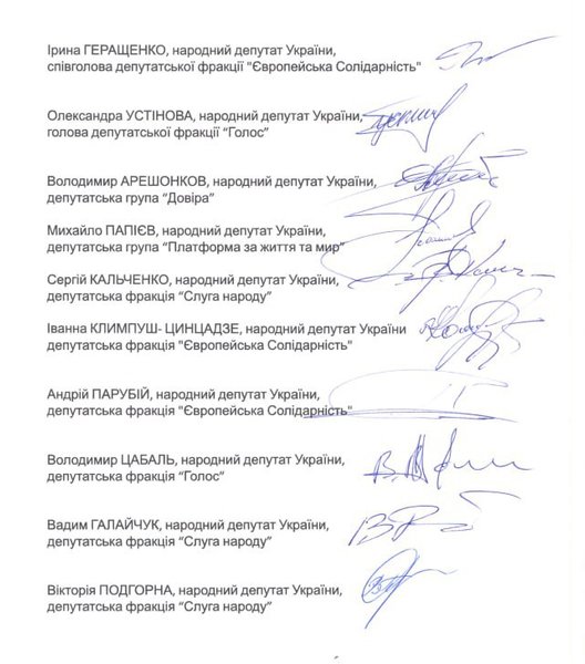 Первая подпись — первого заместителя председателя Верховной Рады Александра Корниенко. Нет подписи представителей депутатской группы "Восстановление Украины", в состав которой входят, например, Вадим Столар, Александр Фельдман, Евгений Шевченко.