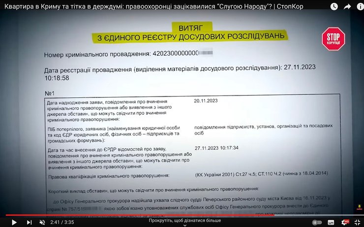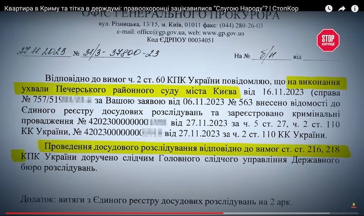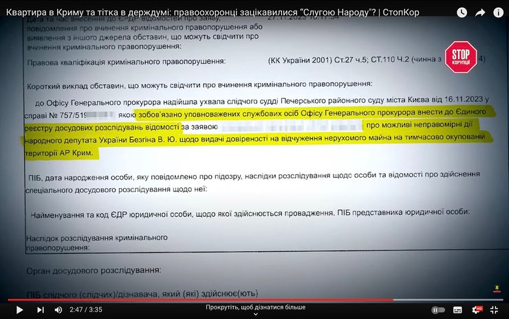 Главное следственное управление Государственного бюро расследований начало досудебное расследование по делу народного депутата от партии "Слуга народа" Виталия Безгина по делу о выдаче доверенности на продажу принадлежащей ему квартиры в Крыму "депутату" "парламента Крыма" от "Единой России". Соответствующее поручение ГБР предоставил Офис генерального прокурора после внесения соответствующих сведений в Единый реестр досудебных расследований. Уголовное производство №42023000000001898 в Едином реестре зарегистрировал генеральный прокурор Андрей Костин. Документы, подтверждающие открытие производства, обнародовали журналисты ОО "Стоп коррупции" в сюжете на своем YouTube-канале, пишут "Украинские новости".