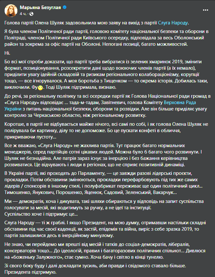 "Все же считаю, "Слуга Народа" не ужасная партия. Здесь работает много нормальных менеджеров, среди партийцев сотни интересных людей. Можно было бы многое развить. И Шуляк не безнадежна. Но партия сейчас существует по инерции и без желания руководства развиваться. Это чувствуют и люди в регионах, что не способствует положительной динамике", — пишет Безуглая.
