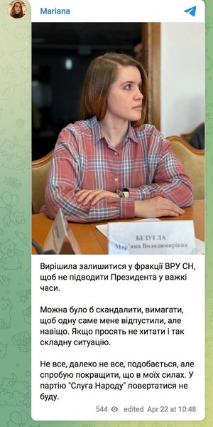 "Решила остаться во фракции Верховной Рады Украины "Слуга народа", чтобы не подводить Президента в трудные времена. Можно было бы скандалить, требовать, чтобы одну именно меня отпустили, но зачем, если просят не шатать и так сложную ситуацию", — написала она.