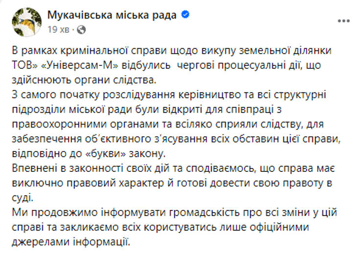 "С самого начала расследования руководство и все структурные подразделения городского совета были открыты для сотрудничества с правоохранительными органами и всячески способствовали следствию, для обеспечения объективного выяснения всех обстоятельств этого дела, в соответствии с "буквой" закона", — говорится в сообщении городского совета Мукачево.