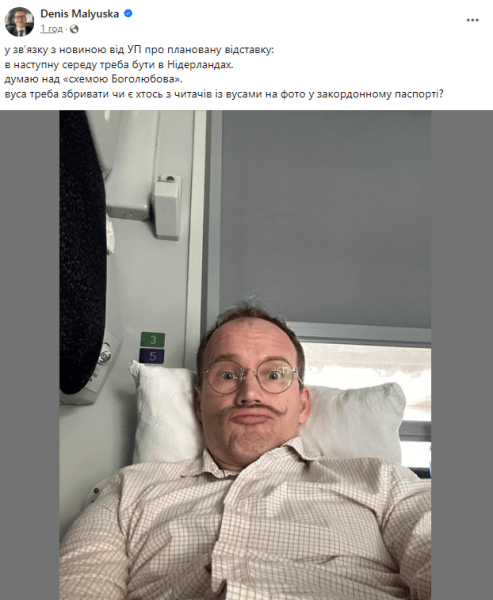 "В связи с новостью от УП о планируемой отставке: в следующую среду надо быть в Нидерландах. Думаю над "схемой Боголюбова". Усы надо сбривать или есть кто-то из читателей с усами на фото в загранпаспорте?", — написал он в Facebook.