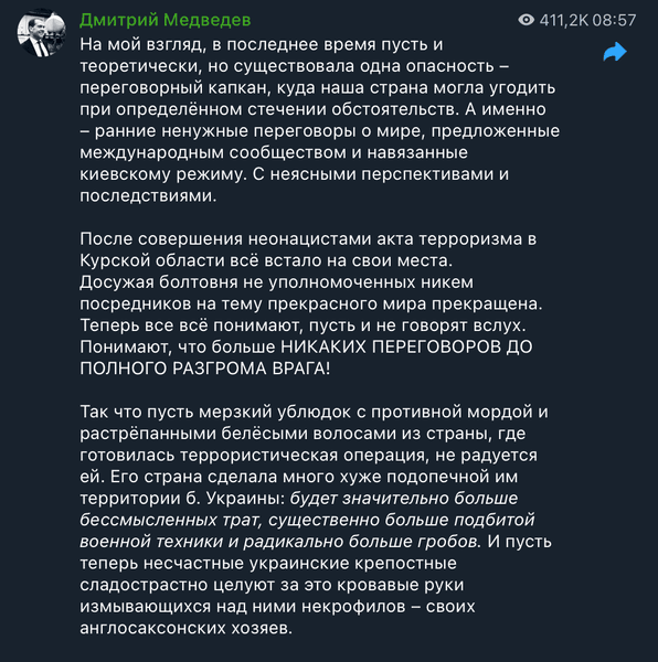 Заместитель председателя Совета Безопасности Российской Федерации Дмитрий Медведев заявил, что якобы Москва могла попасть в "переговорный капкан". Однако уже якобы не будет никаких мирных переговоров "до полного разгрома врага". Об этом он написал в своем Telegram.