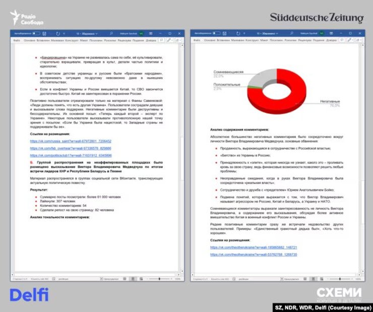В полученных документах есть отчеты о проделанной работе, где аналитики команды отмечают, что фигура Медведчука вызывает преимущественно негативные комментарии в российской соцсети "Вконтакте". В частности, речь идет о том, что таких комментариев — 76%. В них пользователи соцсетей обвиняют Виктора Медведчука в продажности, бегстве из Украины и тому подобное.