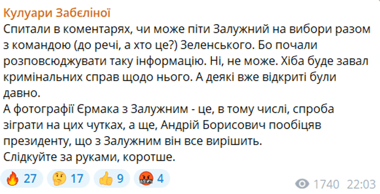 "Еще Андрей Борисович пообещал президенту, что с Залужным он все решит. Следите за руками", — подытожила она.
