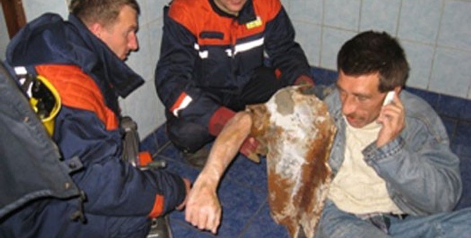 Пострадавший рассказал, что при посещении туалета он обронил в унитаз 200 гривень. Не желая расставаться с такой суммой, он залез по локоть в отверстие, чтобы достать деньги. Вытащить руку назад мужчина уже не смог.