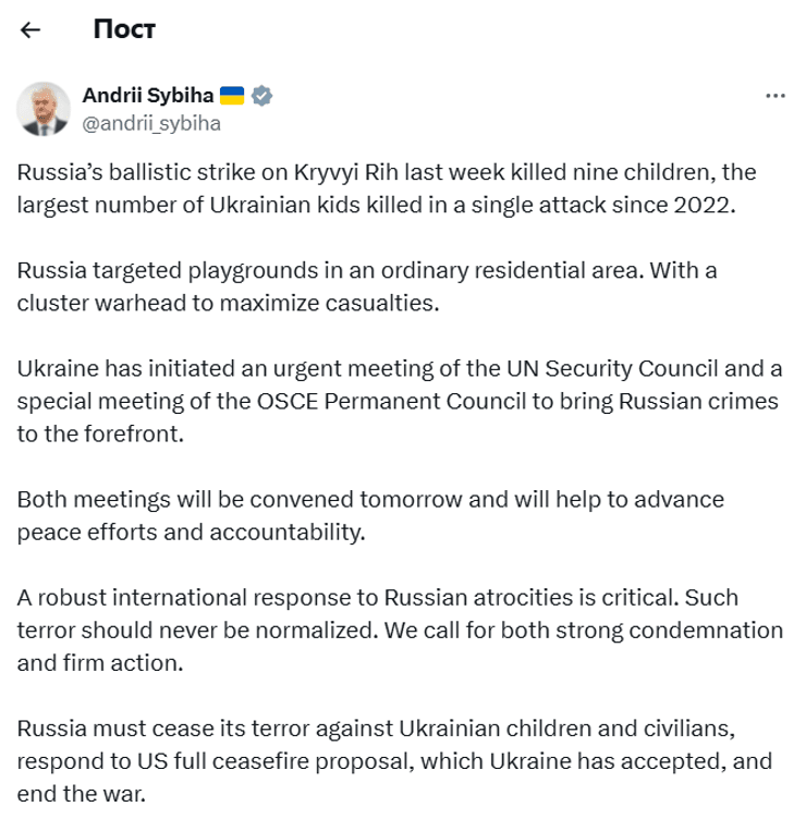 Андрей Сибига напомнил, что баллистический удар по Кривому Розу на прошлой неделе унес жизни девяти детей, что является наибольшим количеством погибших украинских детей во время одной атаки с 2022 года. Министр подчеркнул, что Россия нанесла удар по детским площадкам в обычном жилом районе ракетой с кассетной боеголовкой, чтобы максимизировать потери.