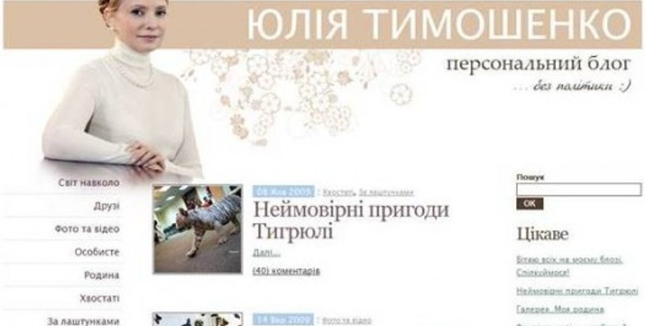В блоге Тимошенко есть рубрики: Світ навколо, Друзі, Фото та Відео, Друзі, Родина, Хвостаті, За лаштунками.
