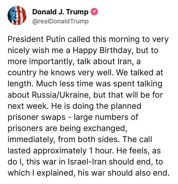 Трамп также добавил, что Путин в разговоре с ним заявил, что конфликт между Израилем и Ираном должен закончиться. В ответ глава Белого дома сказал, что его война в Украине также должна завершиться.