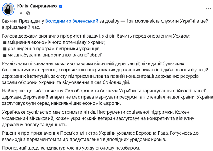 "Прежде всего, это обеспечение Сил обороны и безопасности Украины и гарантирование устойчивости нашего государства. Госаппарат не имеет права тратить ресурсы и потенциал нашей страны. Украина заслуживает места среди сильнейших экономик Европы", — полагает Свириденко.
