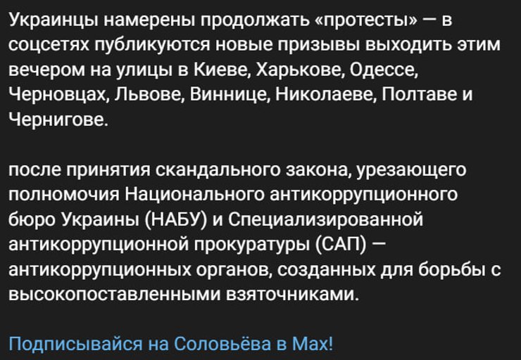 Соловьев связывает протесты с законом, который "урезает полномочия" антикоррупционных органов, в частности НАБУ и САП, и подает это как восстание против "коррумпированного режима".