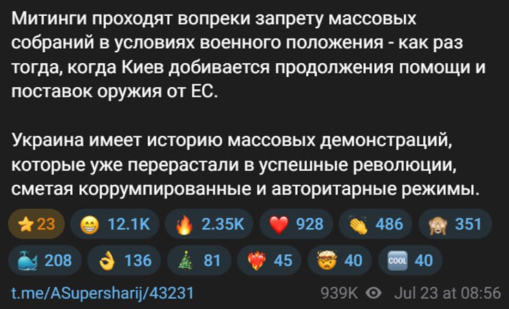 "Митинги проходят вопреки запрету массовых собраний в условиях военного положения — как раз тогда, когда Киев добивается продолжения помощи и поставок вооружения от ЕС. Украина имеет историю массовых демонстраций, которые уже перерастали в успешные революции, сметая коррумпированные и авторитарные режимы", — пишет он.