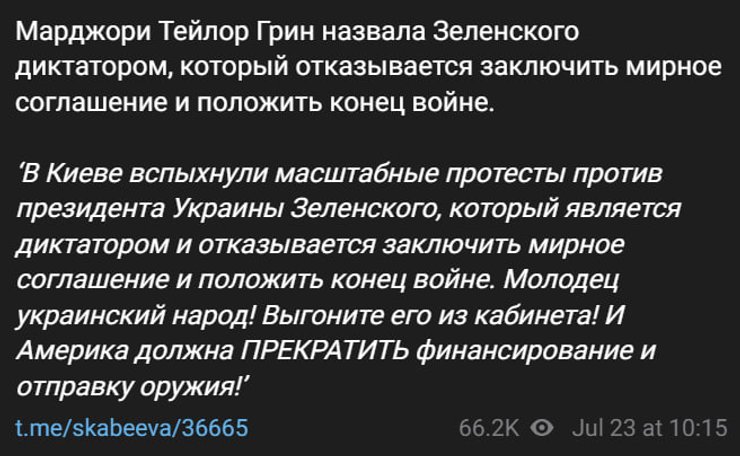 Так, пропагандистка Ольга Скабеева в своем телеграм-канале опубликовала пост с призывом к свержению президента Украины, используя заявление американской конгрессвумен Марджори Тейлор Грин: "В Киеве вспыхнули масштабные протесты против президента Украины Зеленского, который является диктатором и отказывается заключить мирное соглашение и положить конец войне. Молодец украинский народ! Выгоните его из кабинета! И Америка должна ПРЕКРАТИТЬ финансирование и отправку вооружения!".