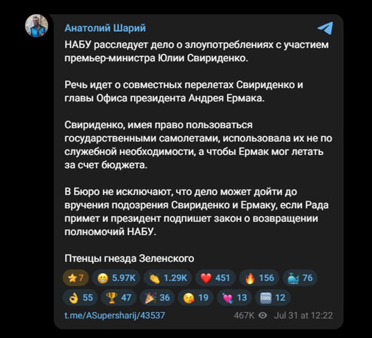 "Свириденко, имея право пользоваться государственными самолетами, использовала их не по служебной необходимости, а чтобы Ермак мог летать за счет бюджета", — написал Анатолий Шарий.