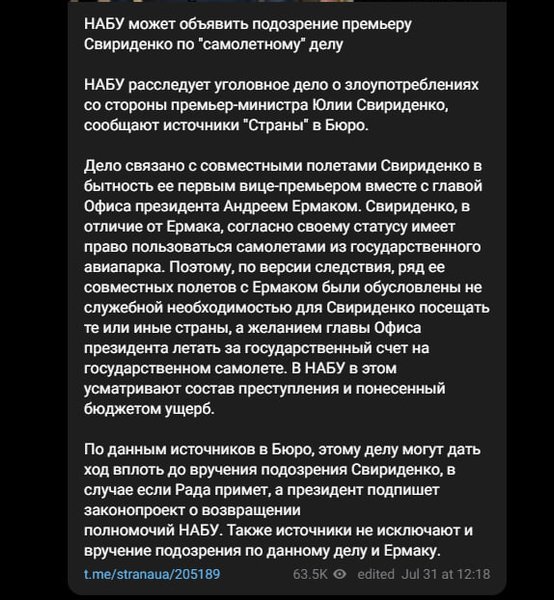 "По данным источников в Бюро, этому делу могут дать ход вплоть до вручения подозрения Свириденко, если Рада примет, а президент подпишет законопроект о возвращении полномочий НАБУ. Также источники не исключают и вручения подозрения по этому делу и Ермаку", — говорится в заметке.