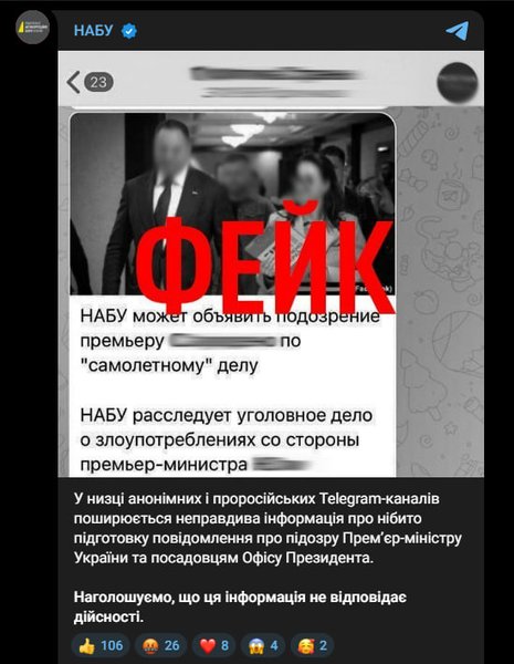 31 июля Национальное антикоррупционное бюро Украины опубликовало официальное заявление, в котором опровергло распространенную в анонимных и пророссийских Telegram-каналах информацию о якобы подготовке сообщения о подозрении премьер-министру Украины и должностным лицам Офиса президента.